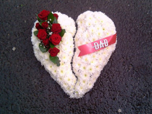 Broken heart on an 18″ frame , massed in white double chrysanthemums , with pleated ribbon around the edge and a matching group of roses