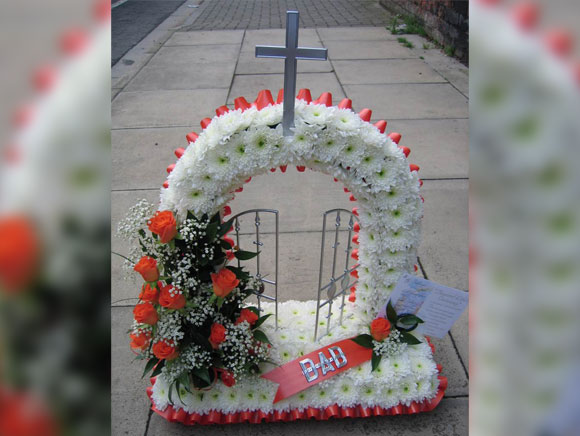 Gates of Heaven, massed in “double” white chrysanthemums with a pleated ribbon around the edge and matching group or roses